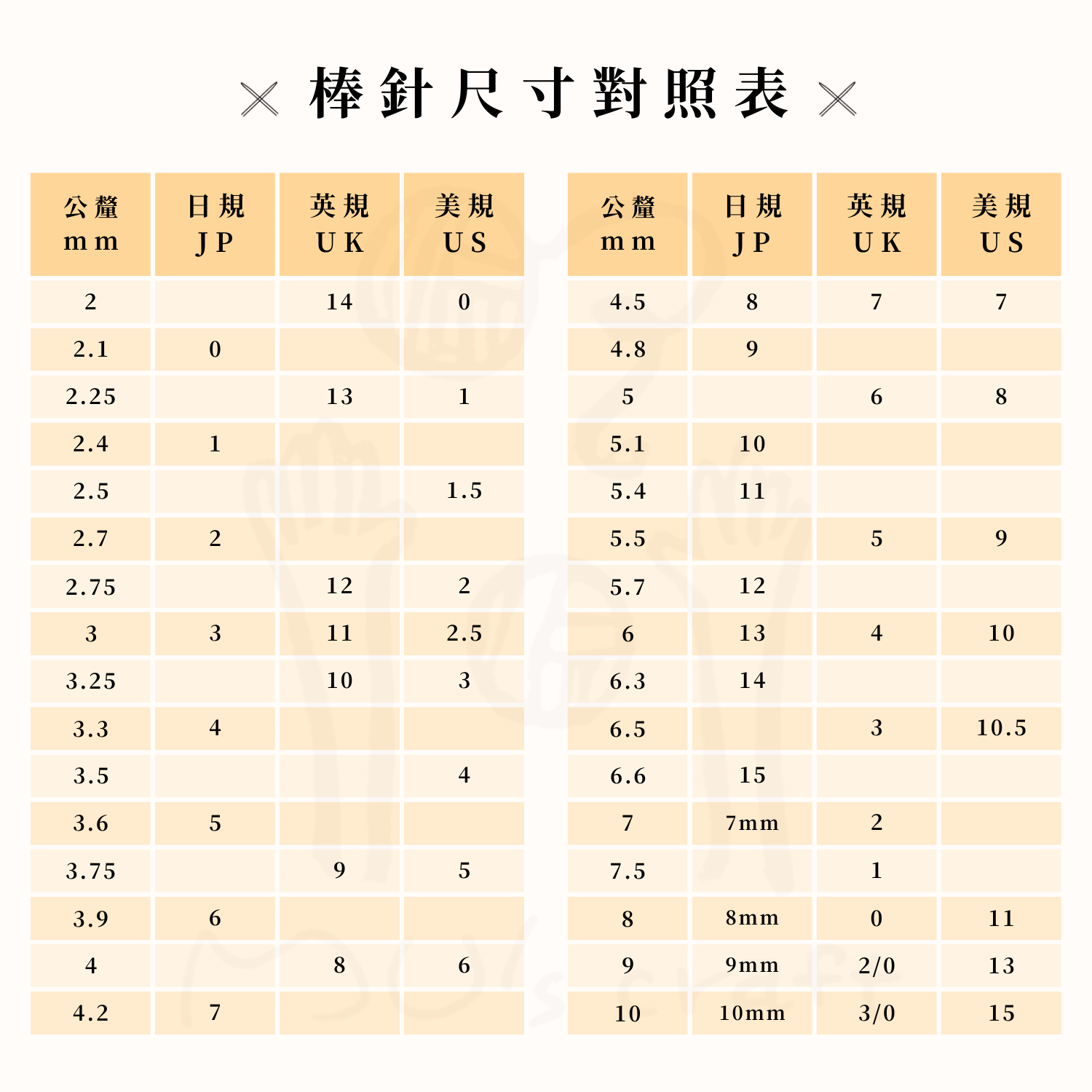 *日規棒針尺寸只標示到15號,所以15號以上的都會直接用mm標示。