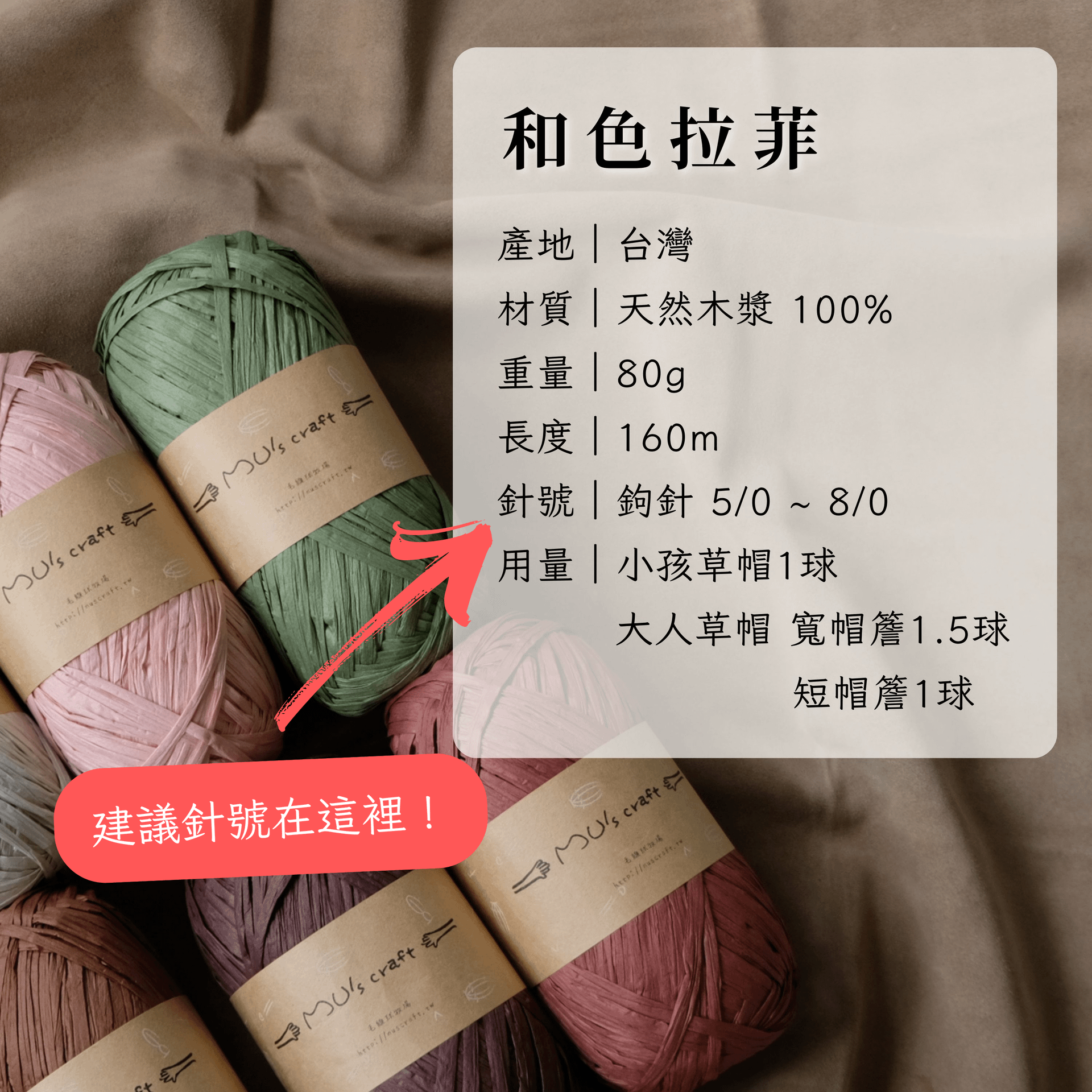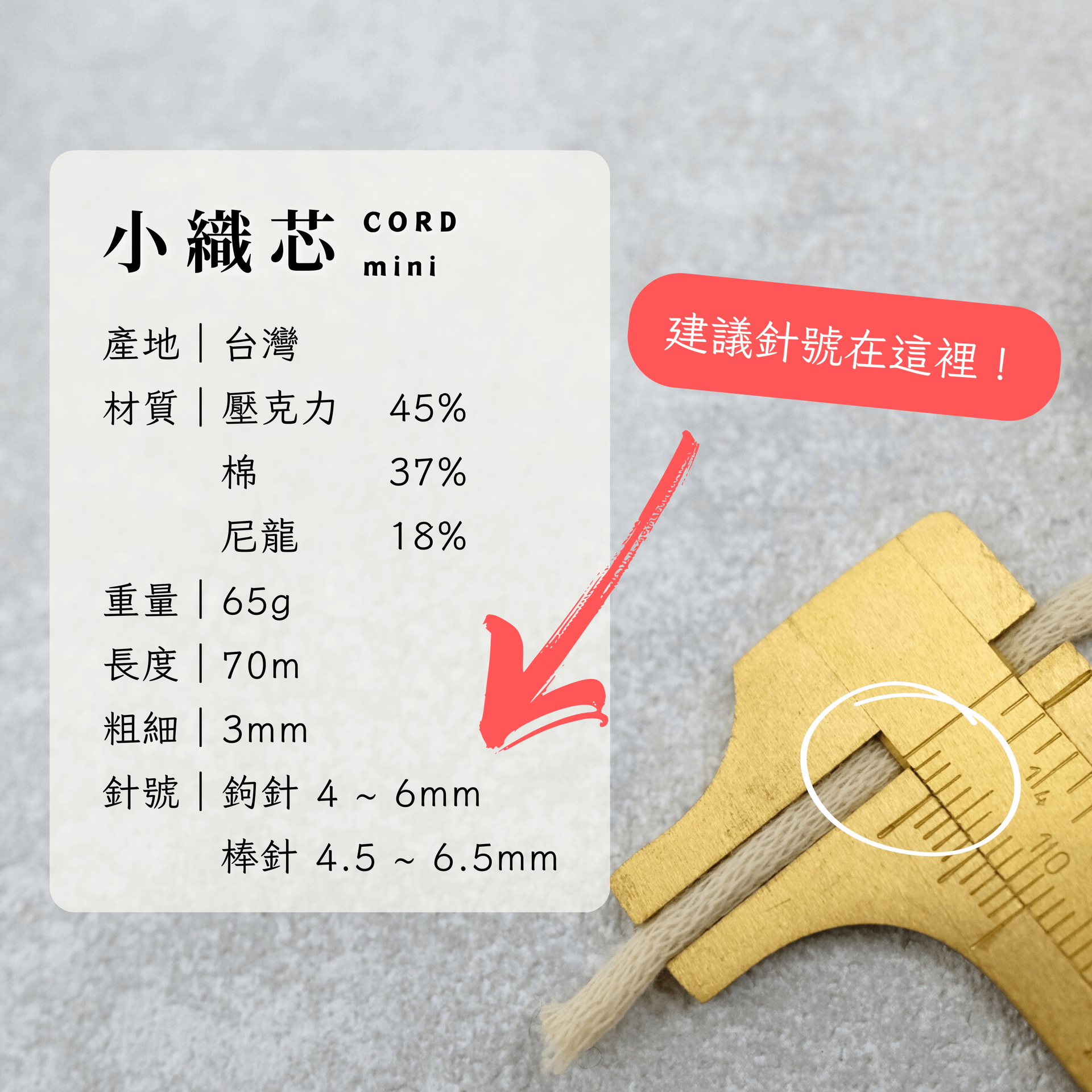 再來就能依著毛線的規格,去找到該毛線標註的「建議針號」,就能夠決定需要購買的針號尺寸嘍!